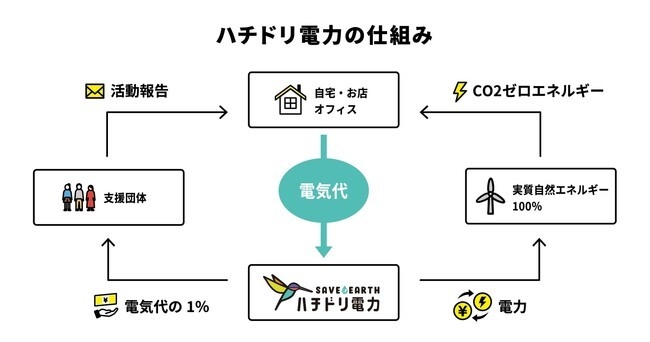 ハチドリ電力は、CO2ゼロの実質自然エネルギー100%プランのみを販売する電力サービスです。地球にやさしい電気だけでなく、社会問題に取り組むNPOやNGOにお金が回る仕組みを提供しています。